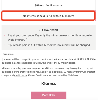 2. Choose from the monthly payment options available. (Please note that monthly payment options are dependent on your cart balance and what Klarna decides to offer, we cannot change it) -